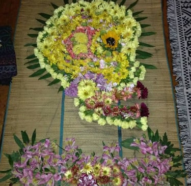 The dancers bring candles and flowers as offerings. The Caracoles announce the start of the ritual around 8:00 PM. The First Word designates those who will go to the altar to create the "Tendido de la flor" (flower layout), a drawing or design with a specific symbol—a type of "mandala"—related to the patron being honored. The Regidor is chosen, and they choose who will offer (sing) the first praise. The chosen person may offer their praise alone or ask other attendees to accompany them; normally, this happens if the chosen person comes with others from a distant town, so they choose to offer their praise together.