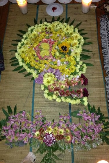 The praises have two parts. The first is a repeating verse sung by everyone present at the vigil; the other is a changing verse intoned only by the person to whom the praise was granted. It is considered that the songs produce specific vibrations which, when intoned in unison, raise the vibration of the place, and these vibrations are imprinted onto the flowers. Those who have gone to the altar to create the figure with flowers "smudge" (cleanse with smoke) each flower and place it in the figure, thus charging the flower with the energies of the copal and the songs of all present. Once the flower figure is finished, the midpoint of the vigil is reached. The participants of the layout share their "word," expressing their feelings about what they experienced during the first part of the ritual. Subsequently, they move to dinner. The Mayordomos of the dance offer generally traditional food to the participants