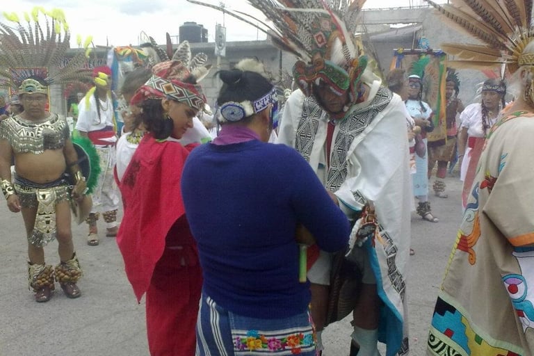 The shells sound around 8:00 AM to wake the dancers, who may have slept only a couple of hours. Everyone begins to dress in their special dance suits. For men, these consist of a maxtlatl (a loincloth) adorning the lower part of the body, and a Pectoral or a tilma (cape) covering the upper body. They also use a feather headdress, knee pads, elbow pads, wristbands, and—indispensably—the bells (ayoyotes), seed instruments placed on the ankles that produce sound when moving the feet. Women dress in a skirt, quechquémitl (a type of indigenous blouse), and all the other mentioned ornaments used by men. Again, the shells sound and the praises begin, inviting everyone to gather in the oratory. A short word is shared, then they proceed to breakfast. Before serving, they give thanks for the food and to the Mayordomos who prepared it with a praise. Again, they return to the oratory so everyone forms into two columns, headed by the First and Second Conchero. The dance of the salute begins—a simple dance invoking the four elements—and it continues with the dance of the march, which allows the columns to advance in procession to the site where the dance will be performed, normally in the atrium of the town church.